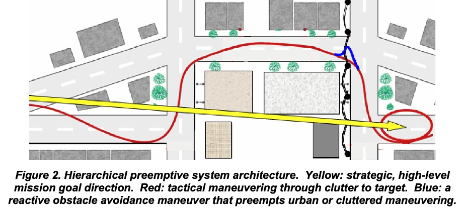 In this project we combine optic flow based negotiation through mid-field clutter using wide-field integration (WFI) techniques (Humbert), active sensing of imminent collisions using bat-inspired echolocation sensing (Horiuchi), and hierarchical application of behavioral and automaton-based navigation and maneuvering strategies (Paduano) to enable autonomous vehicles to conduct military intelligence, surveillance, and reconnaissance (ISR) missions in challenging and uncertain environments.